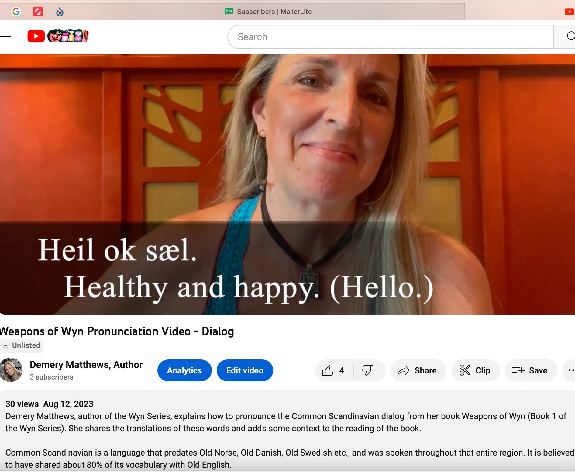 Subscribe to her monthly newsletter and receive a link to an exclusive video where she shares how to pronounce the Common Scandinavian dialogue used in Weapons of Wyn.
